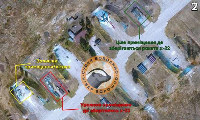 Согласно данным спутниковой разведки, опубликованным киберсообществом «Киберборошно», в результате удара были уничтожены склад с хранившимися там ракетами «Х-22/32», а также техническое помещение, в котором осуществлялась заправка и подготовка этих ракет к пускам.
