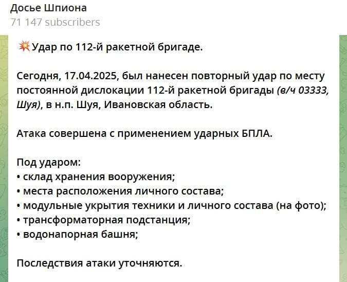 Именно 112-я ракетная бригада, дислоцированная в Шуе, подозревается в причастности к удару по городу Сумы 13 апреля, в результате которого погибли 35 мирных жителей, в том числе дети. На фоне общественного резонанса повторная атака дронов по этой части выглядит как целенаправленный и символический ответ.