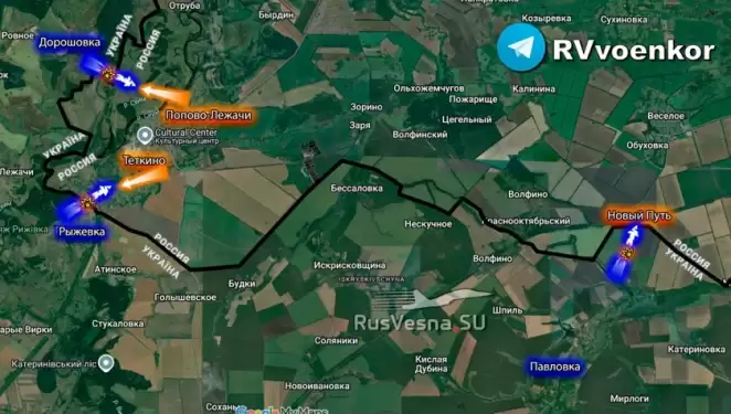 Утверждается, что ВСУ пытаются прорваться через границу в районе села Теткино, которое расположено неподалеку от границы. По некоторым сообщениям, удар наносится также юго-восточнее, в районе населенного пункта Новый путь. В результате ударов был разрушен мост через реку Сейм в селе Званое.