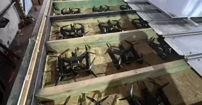 По словам собеседников, СБУ сначала переправила в Россию fpv-дроны, а затем — мобильные деревянные домики. Позже на территории России дроны были спрятаны под крыши домиков, размещенных уже на грузовых авто.