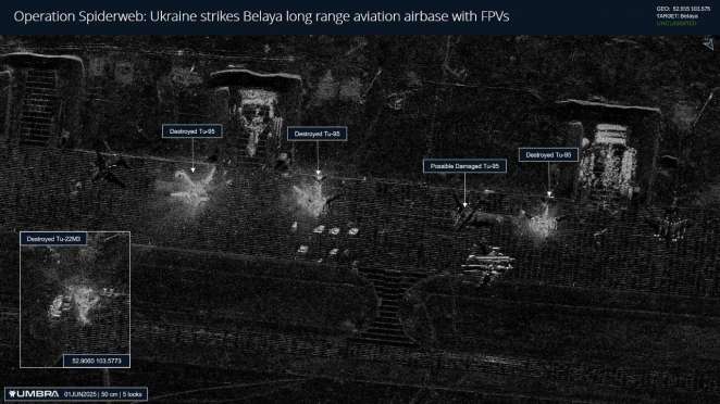 Тем временем OSINT-аналитик Крис Биггерс детально изучил два новых спутниковых снимка с аэродрома Белая. В итоге он пришел к выводу, что во время операции «Паутина» было уничтожено только на одном аэродроме три самолета «Ту-95МС» и четыре самолета «Ту-22М3». Еще один Ту-95 получил повреждения.