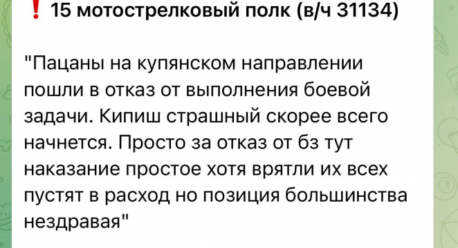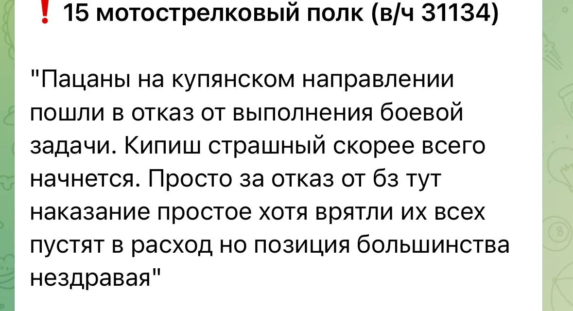 Военнослужащие 15-го мотострелкового полка (в/ч 31134), действующие на Купянском направлении, отказались выполнять боевую задачу. Внутри подразделения назревает «страшный кипиш», как описывает один из источников.