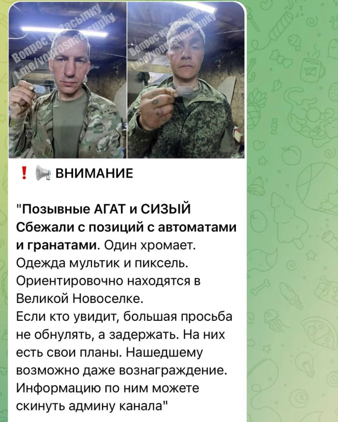 Сразу два свежих сообщения из российских источников свидетельствуют: бегство с позиций с оружием стало не исключением, а закономерностью. В районе Великой Новоселки разыскиваются двое военнослужащих с позывными «Агат» и «Сизый».