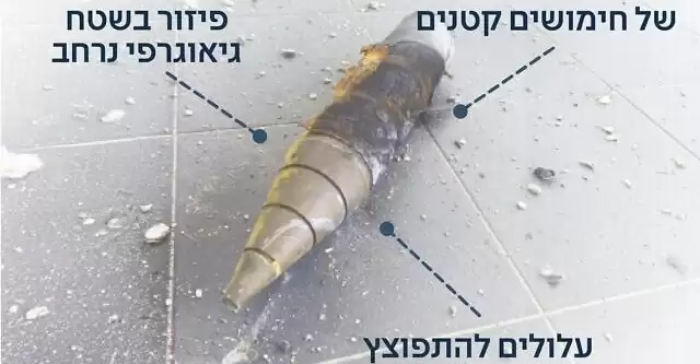 По информации израильских офицеров, боевая часть ракеты разделилась во время спуска на высоте около 7 километров, разбросав около двух десятков небольших боеприпасов в радиусе около 8 километров.