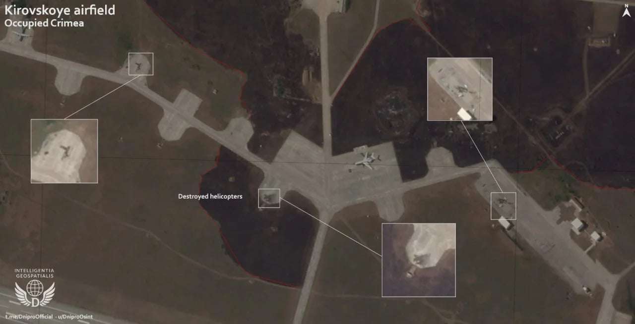 Спутниковые фото подтверждают, что пожары были именно на точках стоянки вертолетов и на двух точках систем ПВО. Также заметны незначительные повреждения инфраструктуры аэропорта, некоторых зданий на территории Кировского.