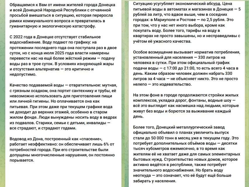 По словам авторов обращения, в Донецке с 2022 года нет стабильной подачи воды. График ухудшается: теперь её планируют давать раз в три дня. При этом она настолько мутная и грязная, что непригодна ни для еды, ни для гигиены. Вода не доходит до верхних этажей, старики и семьи с детьми носят ведра из подвалов.