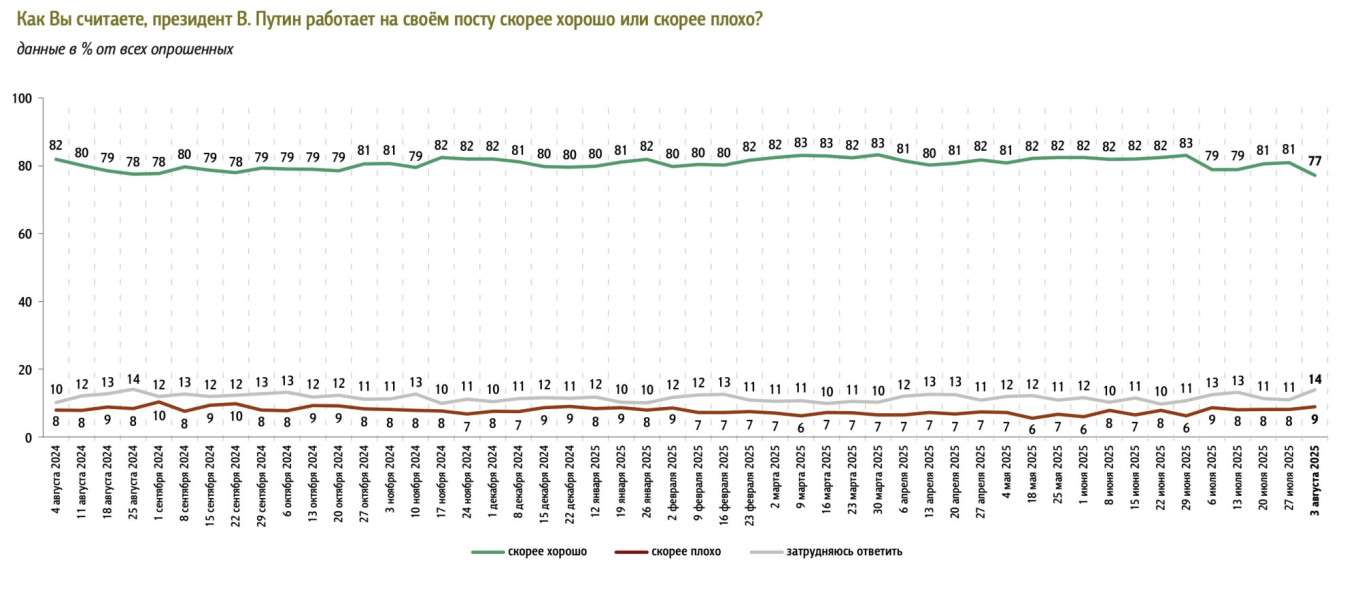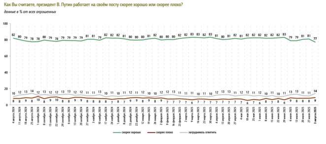 Доля россиян, которые считают, что Владимир Путин[/b] работает «скорее хорошо», по состоянию на 3 августа опустилась до 77% — самого низкого значения с ноября 2023 года, следует из еженедельного опроса ФОМ.