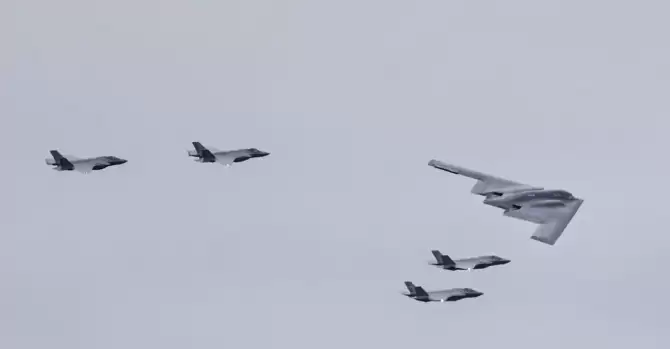 Над аэродромом пролетели четыре самолета F-35 с базы ВВС «Эйелсон» на Аляске и бомбардировщик-стелс B-2 с базы «Уайтмен» в Миссури, рассказал CBS News знающий о подготовке минипарада американский чиновник. B-2 использовались для бомбардировки в июне подземных ядерных объектов в Иране. Туда они вылетели как раз с базы в Миссури, чтобы осуществить, как его охарактеризовали американские военные, «крупнейший оперативный удар с применением B-2 в истории США».