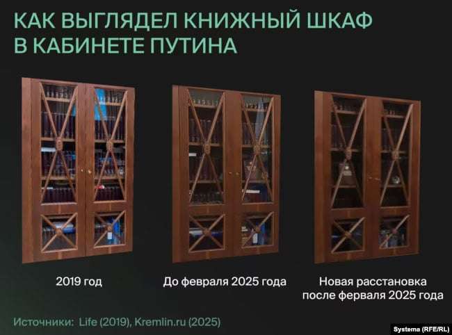 Расследователи выяснили, что между 17-м и 24-м февраля 2025 года в кабинете Владимира Путина в Кремле поменяли расстановку книг на книжных полках, которые обычно попадают в объективы камер во время его приемов. В частности, появились новые издания, а конституция РФ переместилась из правой части шкафа в левую.