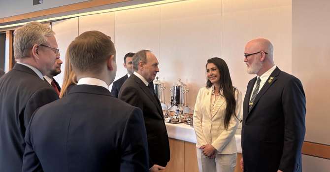 В состав российской делегации вошли Вячеслав Никонов, Светлана Журова и Александр Чернышов. Все они находятся под санкциями США за поддержку оккупации Крыма и участие в войне против Украины. Несмотря на ограничения, Госдепартамент разрешил им въезд в страну.