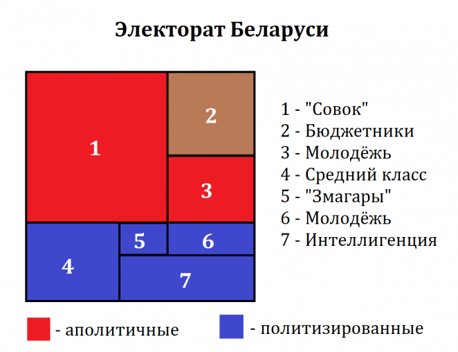 Причины неудач белорусской оппозиции лучше всего разбирать на примере 2010 года, когда она решила взять президентство не единым кандидатом, а девятью. Давайте посмотрим на примерную схему белорусского электората (не спрашивайте, где я её взял, просто поверьте):