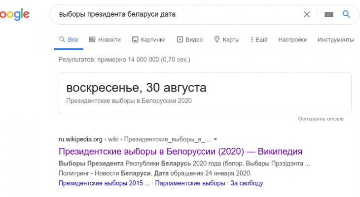Если ввести в поиск Google фразу “выборы президента Беларуси дата”, вам покажут результат “30 августа”.